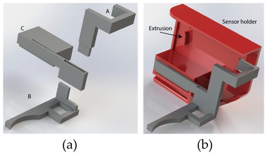 3D-printed components to provide “plug-and-play” deployment and operation within sanitizer dispensers: (a) compliant mechanism and (b) sensor module holder.