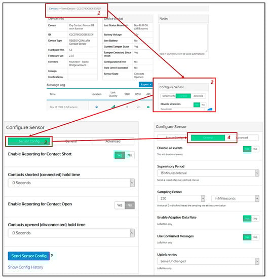 - Remote configuration and management: the sensor manufacturer provides an accessible network server service (Radio Bridge Console [31]), allowing remote sensor configuration and troubleshooting.