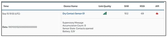 We used the Radio Bridge Console [31] as a network server, which is provided by the sensor manufacturer for receiving data and configuring sensors. Figure 7 shows an example of sensor configuration, during which the sensors were set to record only the “wire connection” event and accumulate all such events detected during a 10-min interval. (As either connection or disconnection indicates the dispenser lever has been pushed, recording only one of them is sufficient for indicating that the lever has been pushed.) A sample data packet received from the sensor is provided in Figure 8, which shows the sensor name (to identify the sensor, as signals from multiple sensors are sent to the console), time-stamp, event type, and signal quality encapsulated in the received data packet. Notably, the application programming interface (API) is provided by the console, which is an uplink for relaying data packets to the subsequent application server for analysis.