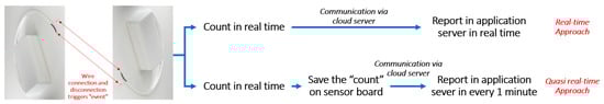 During our initial testing of the sensor module, we observed that, when the dry contact input was rapidly connected and disconnected, the event could miss being detected. Further investigation uncovered two possible reasons for this: (i) the fastest sampling rate of the sensor module is every 250 ms (4 Hz), so connect/disconnect cycles faster than this may be missed; or (ii) the sensor module does not register the event when sending information to the network server. To address these issues, we reconfigured the sensor mode to be “quasi-real-time”, in which the sensor keeps tracking the connect/disconnect events but stores this information on the sensor module, then sends out the cumulative counts at a fixed interval (e.g., every 10 minutes). Such an approach helps to mitigate the chance of conflict between dry contact detection and data communication.