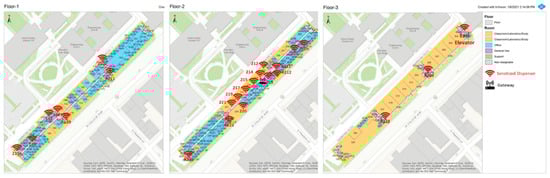 To test the operation of the proposed approach in a real-world scenario, we further deployed the developed prototype on a university campus as a case study. The Hammond Building on Penn State’s University Park campus was selected for deployment of the developed sensor units due to its size and the large number of installed sanitizer stations. The Hammond Building is a four-story (with sub-basement) building that was constructed in the 1950s using reinforced concrete with an aluminum frame curtain wall and internal metal walls. It has a total area is 159,912 sq. ft. [34] and represents an extremely challenging environment for radio-frequency propagation. As shown in Table 2 and Figure 11, a total of 24 sensors were deployed in sanitizer stations throughout the building. The gateway was deployed on the second floor, near the center of the building. The gateway was connected to the building’s IT network via a 1000 BT wired connection.