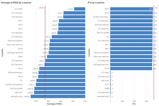 The field test aimed at validating the operation of proposed sensor networks in a real-world application scenario. In this initial study, we evaluated the signal coverage of the deployed sensor network and whether the messages from the sensors could be successfully detected when deployed at scale. The field test results are summarized in Table 4. After deployment of the sensor network in the Hammond Building, we first examined signal quality by sensor location, as shown in Figure 12 with sensor location illustrated in Figure 11. We compared the average signal quality, measured by RSSI, of the received signal from each sensor module over a five-day period. The results show the average RSSI of 23 sensors was −85 dBm, with all RSSI values above −120 dBm.