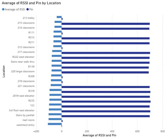Figure 13 shows a further comparison of the number of received messages by sensor signal quality. Results showed that the low signal quality may not necessarily lead to the missing of messages from the sensors. For example, the sensor placed at the “stairs by parklet” worked properly even without a high-quality signal. The sensor with a strong signal quality could also miss packets, such as the sensor in the 213 lobby, closest to the gateway. Further work should be conducted to investigate the factors besides signal quality affecting the number of events received.