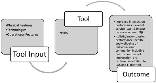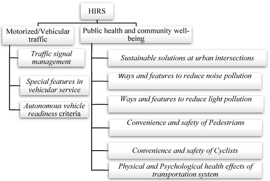 - It addresses two relatively new topics in urban transportation: the readiness of existing infrastructure to support autonomous vehicles (AV) and the effects of transportation systems on the mental health of users and residents of surrounding environs. HIRS aims to improve services that an intersection provides to users regardless of mode and level of technology penetration. Pedestrians, cyclists, and AVs are equally recognized and supported, consistent with the notion of creating complete streets [8,9]. HIRS also incorporates and rates features that affect the mental health of transportation system users and nearby residents. Subtle but significant issues of viability such as community severance and noise and light pollution have direct and indirect health impacts both on intersection users and nonuser nearby residents. HIRS captures and values the notion that a transportation system should not impede but, rather, facilitate the transit of users between points of interest while at the same time augmenting their experience through the promotion and enforcement of known positive health enablers (as physical designs, sound, and visual effects). Besides governmental agencies with traditional health-centric roles, now transportation units are increasingly seen as health-promoting agents; their traditional role of creating and maintaining the transportation system to support economic efficiency is now being augmented with promoting environmental sustainability, public health, and community character [8]. In the end, it is almost impossible to disconnect the notions of economic and environmental efficiency and technological advancement from social sustainability. The health of individuals and communities spans all those contemporary notions. HIRS is square at the intersection of all those conceptions.