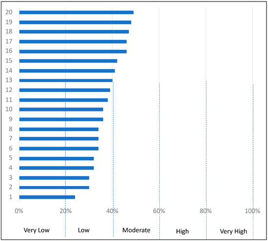 | Final score = 0–6.25 (Percent final score: 0–20%) Very low level of usage of technologies and physical design and operational features | Final score = 6.25–12.5 (Percent final score: 20–40%) Low level of usage of technologies and physical design and operational features | Final score = 12.5–18.75 (Percent final score: 40–60%) Moderate level of usage of technologies and physical design and operational features | Final score = 18.75–25 (Percent final score: 60–80%) High level of usage of technologies and physical design and operational features | Final score = 25–31.25 (Percent final score: 80–100%) Very high level of usage of technologies and physical design and operational features |