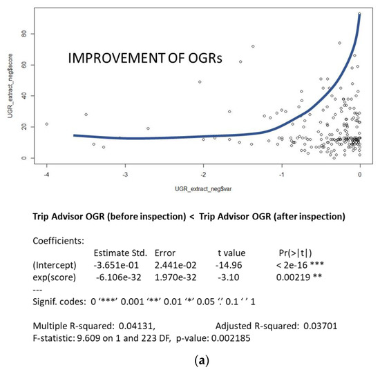The results of our study (“health score” versus “OGRs_extract_var”) are presented in Figure 1a,b. Figure 1b represents negative evolution, i.e., there is a deterioration of the OGRs, while Figure 1a shows when the evolution is positive. For Figure 1b, we observe a logarithmic correlation, while in Figure 1a we observe an exponential correlation, with significance degrees of 0.002185 and <2.2 × 16−10 p-values, respectively. We interpret these results as follows. If TripAdvisor reviews worsen (“OGR_extract_var” with positive values), we conclude that the restaurant’s owner has reacted with a corrective action plan. The latter increases restaurant quality and compliance with food safety regulations, and the consecutive health score results lower (which is, we recall, synonymous with the lower irregularities in these reports).