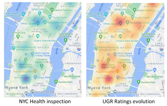 In sum, our findings reveal a U-shaped behavior or correlation between health inspection ratings and OGR scorings. To improve visualization of the results, we decided to use the Quantum GIS (QGIS) software platform, a free and open-source desktop geographic information system (GIS) application, to map the OGR and health inspection results. QGIS allows users to create maps composed of either raster or vector layers and based on the geolocalization of all the restaurants. The results are shown in Figure 2 and illustrate, firstly, how OGRs can be used to identify patterns/clusters of health risks related to distribution of restaurant health conditions on a city scale. Secondly, they reveal a clear visual overlap between OGRs and health inspection results. The correlation rate is 0.82. This outcome confirms, at a macro level, the benefits of OGRs and their potential beneficial uses for heath protection [28,29,30].