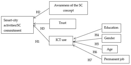 If citizens trust in ICT-based SC services, they will positively accept and use the ICT-based SC services []. However, Novo Vázquez and Vicente [] did not find trust in governments to be a significant factor explaining e-participation, which is one of the dimensions of smart cities (smart governance). Therefore, we can pose hypothesis 3.