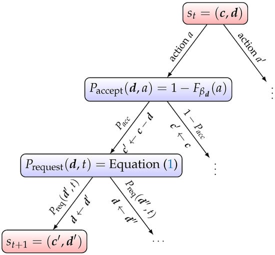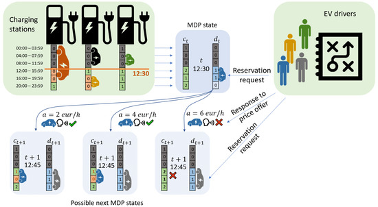 MDPs provide a model for decision-making problems under uncertainty, with solutions either optimal or converging to optimal in expectation (with respect to the probability distributions involved). MDPs are defined by the tuple , where S is the set of states, is the transition function, R is the reward function and A is the set of available actions. For the dynamic pricing of the EV charging problem under study, we will describe these four components separately.