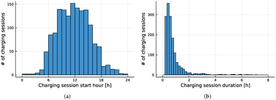 Figure 3 shows the histograms of the start time and duration of the charging sessions contained in the dataset. For our problem instances, we approximate these histograms using normal distribution and exponential distribution, respectively. In the dataset, the start times and duration appear uncorrelated (Pearson’s correlation coefficient