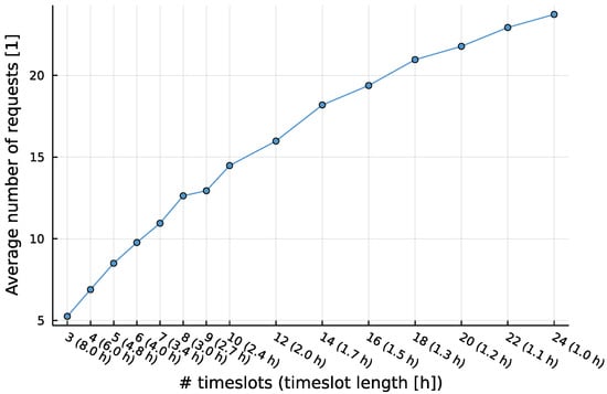 For the first experiment, we generate 15 parametric problem instances with different charging timeslot sizes (between 8 h and 1 h) and a different number of timesteps (each instance having the number of timesteps equal to the number of timeslots times 8). We set the demand scaling parameter, the expected number of requested timeslots, so that the total requested charging duration (The expected total requested charging duration according to the MDP distributions, not the sum of charging duration of all sampled requests) of all charging sessions is of the total charging capacity. The charging location is equipped with three charging points capable of serving three simultaneous charging sessions.