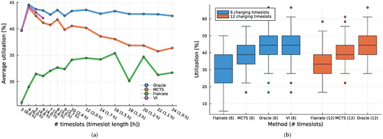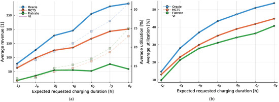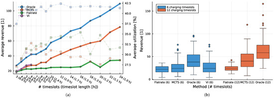 Figure 5a, the revenue of the oracle baseline and MCTS increases with an increasing number of timeslots. This is caused by the fact that we keep the total requested charging duration the same in all problem instances. Increasing the number of timeslots increases the number of individual charging requests. The finer timeslot discretization allows the total expected charging duration to be split up into more differently sized charging sessions. The oracle and MCTS can leverage this larger number of requests to prefer requests from EV users with higher budgets. Since the flat rate can not respond this way, the revenue from the flat rate remains level.