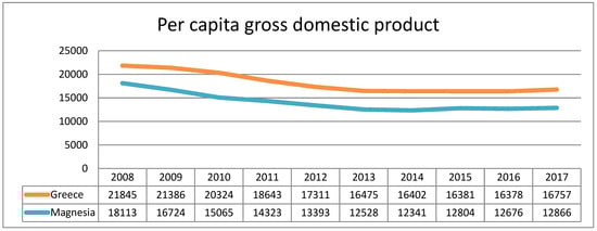 The economic identity of Volos is reflected through the GDP index/resident of the regional unit of Magnesia. According to the Figure 1., the regional unit of Magnesia follows a downward trend from 2009 until 2014, and then has a small increase, after which it remains relatively stable until 2017. Still, compared to the corresponding index, the regional unit of Magnesia appears to be almost €5000/inhabitant below the whole country.