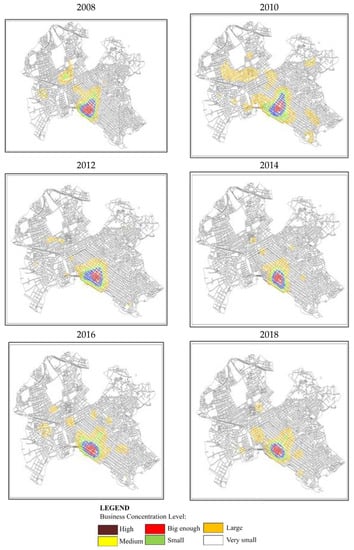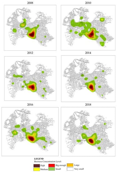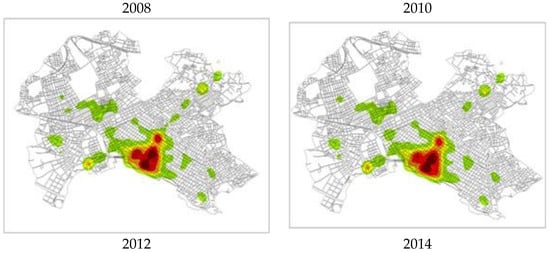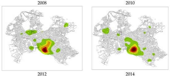 The kernel density estimation method analyses the concentration of economic activity over the years. This is an analysis of point events and concerns the spatial concentration of these events. The surface thereby produced highlights the intensity of events in this area, as shown by Figure 4, Figure 5 and Figure 6. This method was applied to all existing economic activities as well as to new and closed businesses.