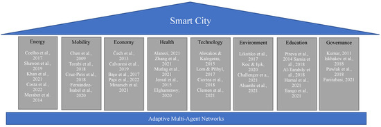 The distributed processing and control of multi-agent systems (MAS) or agent-oriented programming (AOP) are some of the main technological paradigms for the efficient deployment of smart devices and services in the smart city [7]. These techniques are considered the best abstraction approaches for modeling the operations and functionalities of IoTs systems in all three layers of perception, network, and application [8]. They also proved their effectiveness in supporting autonomous networks of the objects in the IoTs with self-adaptive and self-organizing properties [9]. There is a large number of instantaneous communications between devices in the IoT. In MAS, each device is mapped to an agent with a predefined range of features and capabilities. This mapping provides a suitable high-performance infrastructure for testing and implementing large-scale data acquisition and offers a scalable platform for the distributed computing of the received data [10]. Moreover, simulating objects as smart-reactive agents enables the real-time tuning of control parameters in complex interconnected networks, such as the IoT. The autonomous agents in the MAS can be programmed and function without human intervention. They are also able to interact with other agents and reflect modular functionalities and coordination. The agents in the MAS also reflect goal-oriented behavior, which is one of the main requirements for managing connected devices in smart cities [11]. These advantages make them suitable platforms for implementing different domains of a smart city, including mobility, environment, governance, energy, economy, health, technology, and education [12]. Figure 1 summarizes some of the related literature for the application of multi-agent systems in different applications in a smart city.