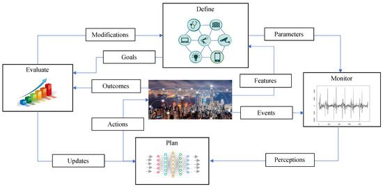 Self-adaptiveness is one of the main requirements in designing pervasive interconnected systems, such as the IoTs and smart cities [13]. The cooperative nature of MAS-based systems and their learning capabilities enable the designing of robust solutions that can adapt their configuration and operations when facing unexpected variations and disruptions [14]. To achieve these abilities, it is necessary to learn from previous events, such as abrupt environmental changes and internal misfunctions, and adapt the controlling parameters and strategies continuously. The overview of a self-adaptive system is presented in Figure 2. A self-adaptive MAS constantly receives feedback from internal units and the external environment. The received data is monitored and analyzed, and perceptions are fed into the planning module to decide the next action and response of the system. Control commands are defined considering system’s main goal and the units’ roles and responsibilities in achieving the desired level. Then, actions are sent back to the actuating units and outcomes are collected for updating the next actions and eventually system evaluation and modifications.