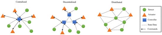 The message passing platform reflects the access level of the agents to high-level information about system status, goals, and constraints. Three main platforms for information flow between agents and controllers include centralized, layers or decentralized, and distributed frameworks (Figure 4). In a centralized approach, one agent has access to agent information and decides for the whole system [95,96]. Scalability, vulnerability to the controller agent failure, and a need for high communication resources for agents are common problems for this approach. To overcome this issue, some researchers used assumptions such as the parametric similarity of the agents to approximate all policies in only one unique policy [97]. After receiving a common policy in this framework, agents can locally explore their policies to minimize their own losses. The common policy is updated interactively using the feedback received from the trajectories of all agents. These techniques are considered as hybrid forms with some levels of decentralized information updates and flow between agents. In decentralized or layered approaches, the system is controlled by more than one controller in each layer or community [98]. This technique is considered more reliable than the previous technique, but it requires a precise definition of the communication and cooperation rules between the controllers. The distributed form is considered the most common technique in controlling MASs, where each agent is responsible for deciding and coordinating with other agents to achieve the main goal of the system [99]. In this technique agents have full autonomy to select their own actions [100]. This technique is more robust and scalable. However, it is more challenging in terms of finding the best decision of the agents given their limitations in exploration and information access. None of these platforms are considered a best option, and depending on the system goals and resources, one specific platform is chosen.