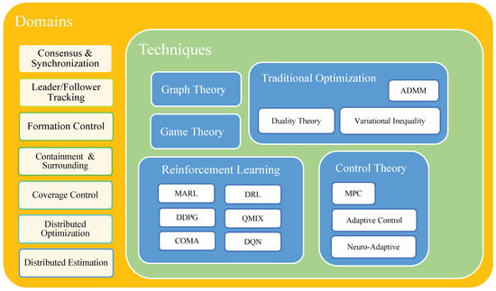 In the literature, various techniques were applied for controlling multi-agent systems, namely graph theory, game theory, control theory, and machine learning, which are considered the most commonly used techniques for this purpose [29,45]. There are also other algorithms such as optimization and bio-inspired algorithms, which were applied for the collective behavior of these systems [233].