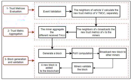 In [] the reputation score is calculated using an indirect reciprocity principle, where each vehicle calculates its reputation score according to its cooperation with other peers. The limitation of this approach is the fact that each vehicle updates its reputation value. Javaid et al. [], propose a blockchain-based protocol for computing trust management on the Internet of Vehicles using smart contracts, certificates, and a dynamic proof-of-work consensus algorithm. The proposed entity-centric protocol consists of two phases: a setup phase and a data transfer phase. In the first phase, the vehicles register to become trusted users and get a blockchain account and unique ID. In the second phase, secure communication links between trusted vehicles are established. However, the proposed protocol revokes malicious vehicles definitively from the network, also it does not assess the credibility of the message itself, so a trust vehicle can broadcast forged messages without being detected. A Blockchain-based collaborative intrusion detection networks (CIDNs) framework is proposed in []. It is a data-centric framework that enables the vehicles to form a consortium chain by verifying the received data messages and the alarm rankings, which uses blockchains. The RSUs serve as a validator, responsible for detecting advanced malicious vehicles. The RSUs compute the trust values by comparing the received messages with the expected content. Unfortunately, this framework does not detect malicious vehicles in real-time. In [], the author proposed a trust management system using a multi-criteria decision-making model, where each vehicle assesses the reliability of the messages and computes the trust value of the sender. Afterward, each vehicle transmits the computed trust values to the nearest RSU, which in turn calculates the trust values using a multi-criteria decision-making model. After that, the RSU creates a block and tries to solve the consensus to add the newly created block to the blockchain. The limitation of this system is the use of the RSU as miners, which is not practical because of their expensive deployment cost.