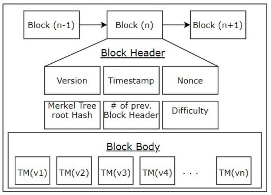 Each block consists of two compartments: the header and the body. The block header contains the block version that indicates the position of this block in the blockchain, the previous block’s hash, Merkle tree root hash, which is a hash value of all the trust metrics included in the current block, the nonce used in the PoW, as well as the timestamp, which is the block generation time. Besides, the header contains difficulty metric D used to solve the Proof-of-Work []. The body contains the list of trust metrics of the vehicles aggregated as explained in the previous section. The structure of the block is shown in Figure 2.