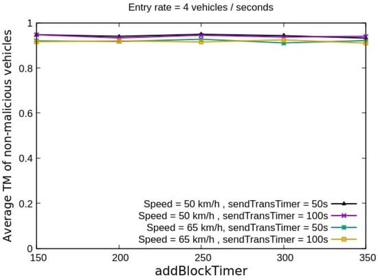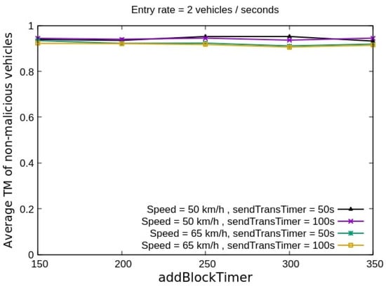 Initially, we are interested in the efficiency of the proposed BC-TMF. Figure 4 and Figure 5 show the average global trust metric (TM) of non-malicious vehicles having PM = 0 as a function of addBlockTimer for an entry rate of 2 vehicles/s and 4 vehicles/s, respectively.