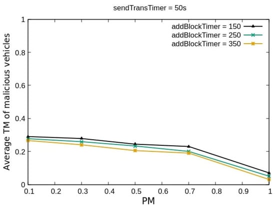 Besides Figure 6 and Figure 7 point out the importance of the sendTansTimer parameter on the convergence of the global TM of the malicious vehicles to lower values. Particularly, we remark that the average TM slightly decreases when sendTransTimer increases mainly for high PM values (>0.5). We notice in Figure 6 and Figure 7 that the average TM slightly decreases also when addBlockTimer increases for high PM values. It passes from 0.25 in case of addBlockTimer = 150 s to 0.19 in case of addBlockTimer = 350 s, for PM = 0.7 and sendTransTimer = 50 s. This result provides enough evidence that addBlockTimer and SendTransTimer must be accurately tuned to obtain exact trust metrics and ensure that the global trust metrics of malicious vehicles converge rapidly to lower values.