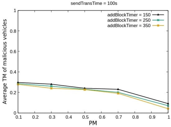 The average trust metric of malicious vehicles vs. PM, sendTransTimer = 50 s.