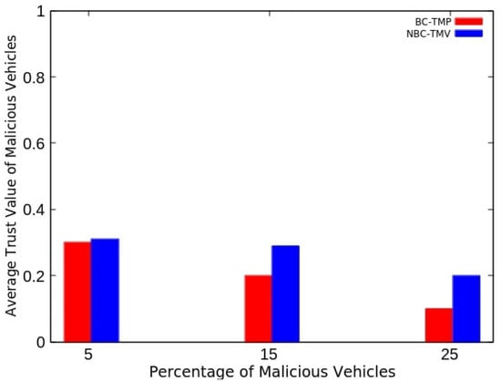 The average trust metric of malicious vehicles vs. the percentage of malicious vehicles in the network.