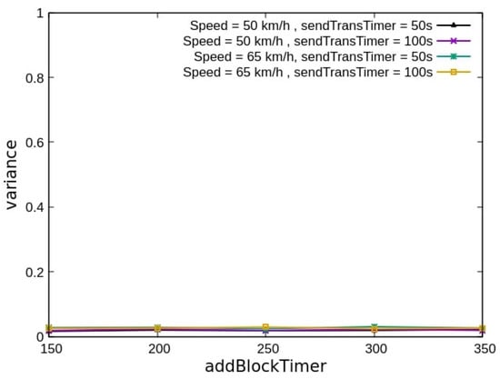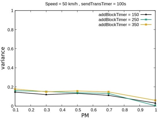 We observe in Figure 10 that the variance does not exceed 0.18. It passes from around 0.18 for PM = 0.1 to around 0 for PM = 1 and addBlockTimer = 350 s. Additionally, it is obvious that addBlockTimer slightly affects the variance. It passes from 0.18 for addBlockTimer equal to 350 s to around 0.15 in the case of PM = 0.1. The value of addBlockTimer = 150 s seems to be the most appropriate to get lower trust metrics for malicious vehicles. This result confirms once again, the excellent capability of BC-TMF to compute exact and consistent trust metrics for malicious vehicles.
