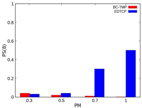 We remark in Figure 11 the huge difference between the results obtained for the proposed BC-TMF compared to EDTCP mainly for PM ≥ 0.7. Particularly, PS(8) is less than 0.02 for BC-TMF. However, it goes to 0.5 for EDTCP, which means that for EDTCP about half of the malicious vehicles having (PM = 1) reaches a trust metric higher than 0.8. Again BC-TMF computes accurate trust metrics, particularly for malicious vehicles.