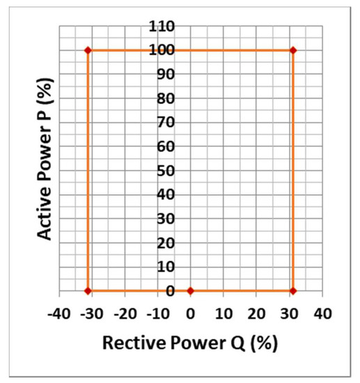 In this work, Benban is selected to work in voltage control mode. According to the Egyptian grid code for hosting large solar power stations, the reactive power range of Benban park varies between −0.33 p.u. and +0.33 p.u. at rated active power as shown in Figure 3.