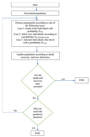 Step 4: stop criteria, the process can be ended at any time without need to control any parameter because the numbers of death- and recovery-based population rates become constant as time passes and the new infected population cannot infect new individuals. It is also possible that at certain iterations, the number of infected individuals increases, however at other particular iterations the number of infected individuals could be small because of the large size of death and recovered populations. A preset stop based on number of iterations is also available in the form of pandemic duration. The social distance can also stop the optimization process.