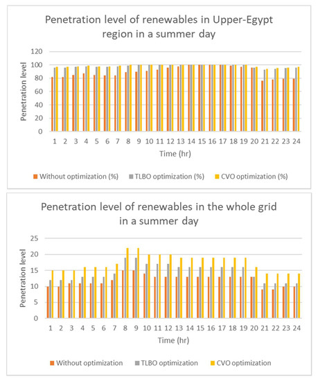 The results show that through applying the CVO to optimally operate the power system, we can achieve 100% renewables in the Upper-Egypt region for more than half a day during the summer day while the time reduces to 11 h with the TLBO optimization. In the case of the system without power system optimization, 100% sustainable energy generation is achieved only 4 h in the region. The share of sustainable energy in Egypt using the CVO optimization reached 15%, or more, twenty hours during the summer day while TLBO achieved the same target only 12 h a day. The power system without optimization reached 15% share of renewable energies only two hours during the day. The total power losses of the system using the CVO are reduced by more than 10% compared to the case with TLBO optimization. In the case of no optimization the system has 30% losses more than that with the CVO and 20% more than with the TLBO technique. The use of the CVO also has resulted in minimum voltage deviation index compared to the TLBO and the case without optimization. The results show that the penetration level of PV can reach up to 12% during the peak sun hours using CVO while it reached 11% only using TLBO. The wind has penetration levels up to 7% using CVO and 5% using TLBO. The hydro has penetration levels up to 10% and 8% using CVO and TLBO, respectively. All the results are based on the existing energy mix.