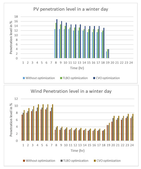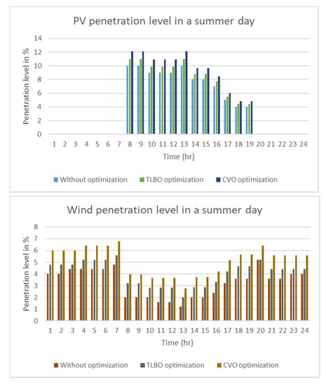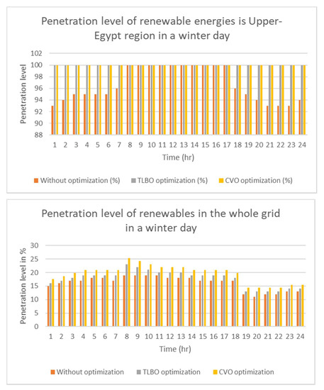 Figure 9 shows the share of the sustainable energies in the Upper-Egypt region and in the entire power system. Figure 10 shows the total power losses and the voltage deviation index. Figure 11 shows the penetration levels of the photovoltaics, wind and hydro without and with applying the CVO and the TLBO power system optimization techniques.