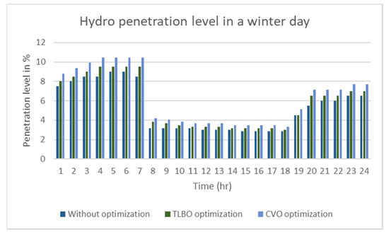PV, wind and hydro penetration level in the whole grid in a winter day.