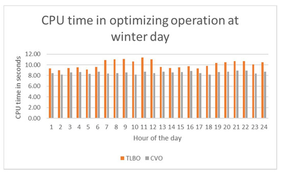 CPU time in the operation of TLBO and CVO at each hour of a winter day.