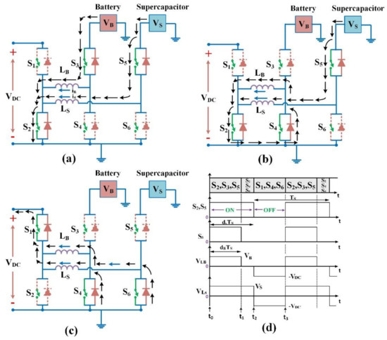 Two-input bidirectional converter equivalent circuit. (a) Operating switches S2, S3 and S5; (b) operating switches S2, S4 and S5; (c) operating switches S1, S4 and S6 and (d) discharging mode steady-state waveforms.