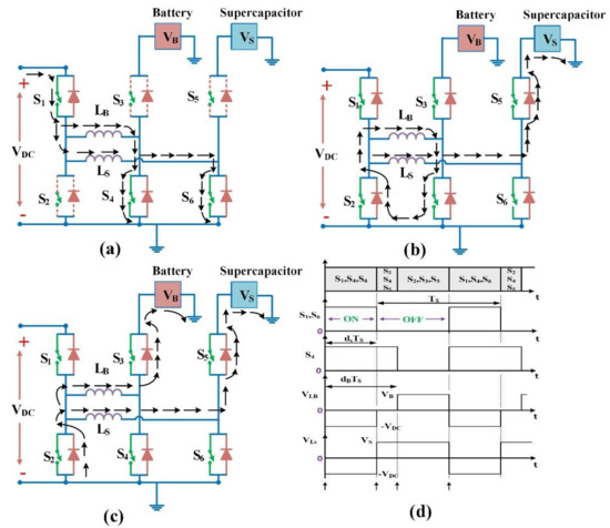 Two-input bi-directional converter equivalent circuit. (a) Operating switchesS1, S4 and S6; (b) operating switches S2, S4 and S5; (c) operating switches S2, S3 and S5 and (d) steady-state waveforms in discharging mode.