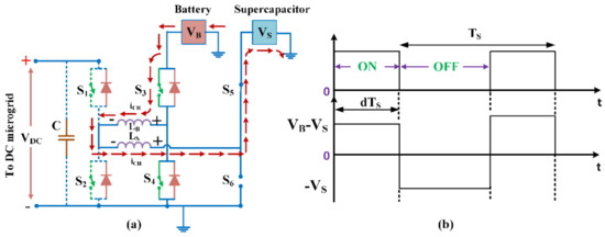 HESS energy exchange method of operation: (a) equivalent circuit and (b) steady-state waveforms.