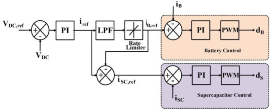 Description of the overall control mechanism for the current bifurcation between the SC and the battery unit for the PI control scheme.