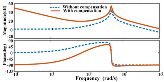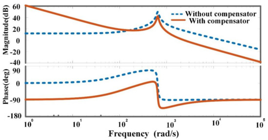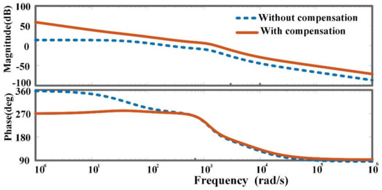 Bode diagram of the outer voltage logic in open loop with and without compensation.