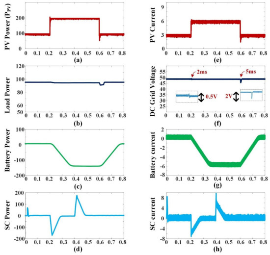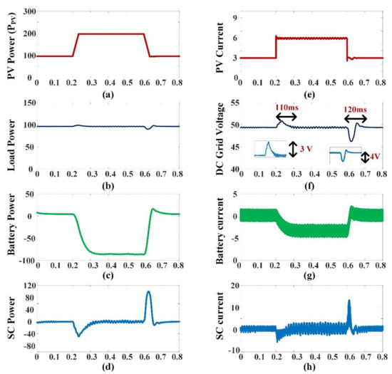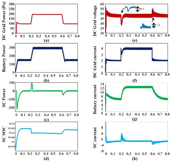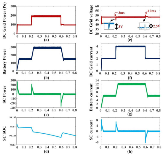 Simulation results for a load demand step change—(a) DC microgrid power demand, (b) battery storage power, (c) SC storage power, (d) SC SOC, (e) DC microgrid voltage, (f) DC grid current, (g) battery storage current and (h) SC current.