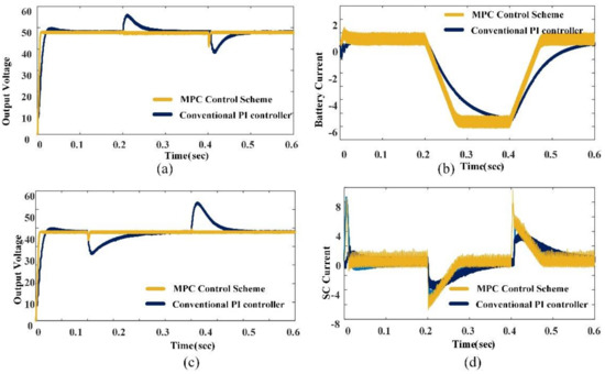 Comparative performance of PI controller over MPC: (a) step change in PV, (b) battery current, (c) step change in load demand and (d) SC current.