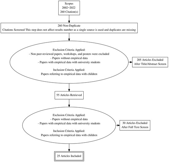 In this phase, non-peer-reviewed papers, workshops, and posters were excluded, as well as papers with a topic that was not relevant for this review. Among the excluded papers were, for example, papers that presented projects with university students or projects involving only the description of artifacts designed for children. To be included in this review, the papers needed to contain empirical data from design workshops with children related to smart cities or objects. Taking these criteria into account, the number of selected papers was narrowed down to 25. Figure 1 summarises and schematically reports the exclusion and inclusion criteria considered during the selection process on the basis of this literature review.