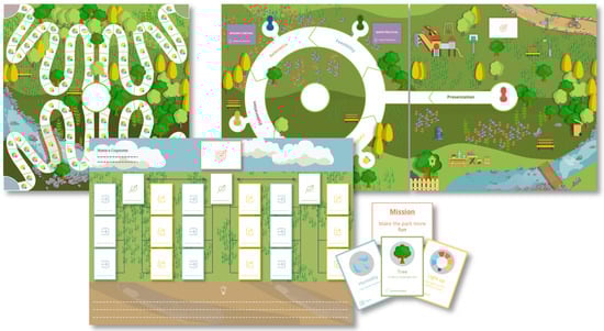 The SNaP workshops are focused on smart-object design by children [64]. They are centred around the SNaP toolkit, a card-based gamified toolkit for children and young teens [65]. The main elements of the SNaP toolkit are cards and boards for conceptualising smart objects. The cards are divided into: mission cards (i.e., goals that smart objects should address), environment cards (i.e., objects related to a park or a school classroom to be made smart) and technology cards divided into input and output cards (i.e., sensors and actuators). Technology cards are matched with the physical computing toolkit that children will later use for prototyping their ideas (e.g., [56,66]). Boards serve to organise cards and conceptualise smart objects. The SNaP toolkit comes into two versions, a physical one (see Figure 5) and a digital one (see left of Figure 6). They have both been used in workshops with children, in presence and at-a-distance described in [48,49,50,51] and in [52,53] respectively.