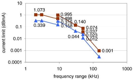 - In a scenario of several EV chargers of the same type, whose emissions overlap with plausible shifts of the switching frequency due to normal tolerance of components and settings and related drift over time, a sufficient bandwidth value should be set to correctly compose alike spectral components and observe the expected compensation, if phase displacement occurs. This is demonstrated in [63], where a 1 kHz bandwidth puts together slightly different peaks around the nominal 10 kHz switching frequency, resulting in mutual compensation, although beating phenomena also take place.
