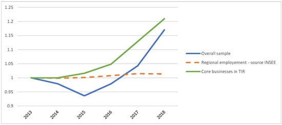 Table 1 shows the evolution of employment growth in firms with a core business related to the TIR and in our overall sample in volume and percent variation compared to the regional situation. We can observe a creation of +26,783 jobs in Hauts-de-France between 2013 and 2018, i.e., a growth of 1.34 percent for all sectors combined. Over the same period, organisations related to the TIR seems to have provided for up to 52,173 new jobs, of which 27,838 were created by firms strongly focused on the TIR activities.