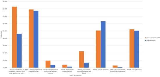 For each pillar, employment growth is derived in terms of volume over 2013 to 2018 and in terms of initial job quantity in 2013. Table 4 shows that employment dynamics differ from one pillar to the next. Activities related to transitioning to renewable energies (Pillar 1) and to developing positive energy buildings (Pillar 2) are largely represented in the sample. They generated a creation of +16.48 percent and +7.29 percent jobs respectively. Fields that are under-represented, and particularly “getting equipped with energy storage systems” (Pillar 3), are also growing strongly (+8.66 percent). Pillar 5 (sustainable mobility for people and goods) shows a similar growth rate but is abnormally under-represented with regards to the importance of the transportation industry in Hauts-de-France []. This under-representation results from the difficulty of identifying sustainable businesses in the transportation industry. Among the cross-sectoral pillars, circular economy (Pillar 6) and energy efficiency (Pillar 8) are particularly dynamic with growth rates of 11.30 percent and 2.86 percent observed in the overall sample. However, these dynamics are stronger for companies with a core business directly related to the TIR. In that regard, energy efficiency (Pillar 8) is marked by a growth rate of 16.38 percent. The trend showed for companies with a core business related to the TIR is twice as strong as for the overall sample in the fields linked to Pillars 2, 6 and 8.