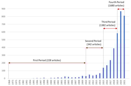 The global publications on the subject of smart urban mobility have been rising gradually since the end of WW2, as illustrated in Figure 1 below. The period between 1968 and 2021 provides a significant overview due to the numerous changes that have been witnessed globally during this period. However, the growth in these publications has not been uniform. For instance, it is evident from the figure that between 1968 and 1995 significantly few publications could be identified relating to the subject matter of mobility. According to U.S. Bureau of Transportation Statistics [18], by 1995, passenger car production was relatively low compared to current trends, due to low demand, fewer manufacturing companies, and insufficient supporting infrastructure in many geographical locations. For instance, in 1995, only 36,717,000 passenger cars were produced globally, with 17.5% of those based in the U.S. By the end of 1995, the global car population was only 670 million [19] compared with a global population of approximately 5.7 billion people [20], indicating that the ratio of passenger cars relative to human population was very small. Further, by this time, the impacts of climate change were not popularized, and the direct links to mobility were not apparent. Additionally, modernist planning ideologies established at the time promoted a heavy car-centric philosophy [4].