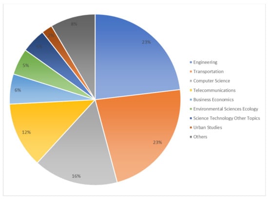 While the visual representation in Figure 3 only shows sources with the highest number of contributions, Figure 4 below helps understand why there are such notable differences in the number of published works from each source. On this, it is evident that a majority of the research works were in the sub-disciplines of engineering and transportation (23% each), whereas computer science and telecommunications had 16% and 12%, respectively. Based on the literature review, the issue of mobility and its impacts especially on sustainability agendas, which gained traction from 2015, is most prominent; hence, explaining why engineering and transportation sub-disciplines had many published works. Moreover, in regard to engineering, research interest is diverse, but such research tends to converge on how engineers could improve machines (including automobiles) to reduce their carbon footprint, particularly machines that are not reliant on non-renewable fuels as electric vehicles are [22]. Similarly, in regard to smart urban mobility, research works on areas such as alternative means of transport, cycling, alternative urban planning models such as the ‘15-min city concept’ [23,24,25], the reduction of private cars in favor of public transport and other areas which would play a significant role in shaping the debate on overall emissions reduction in the transport sector.
